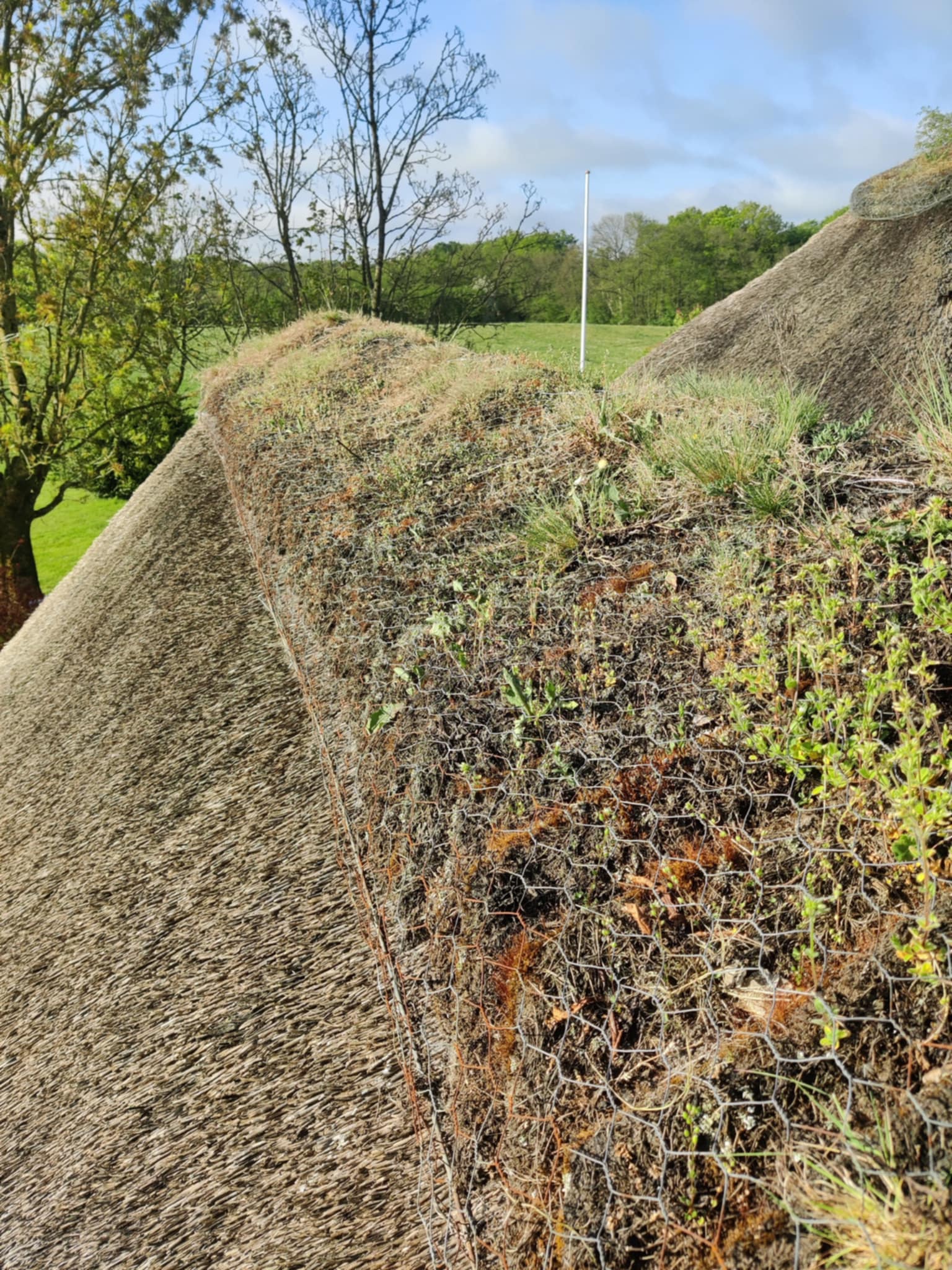 Lyngmønninger er dem, jeg laver flest af. De koster lidt mere end hø, men holder også længere – typisk 7–9 år. Ulempen ved lyng er, at det med tiden formulder, hvilket kan give grobund for uønsket beplantning i mønningen. Derfor bør en lyngmønning tømmes helt ved fornyelse. Også lyng har jeg ofte på lager, og den kan bestilles fra dag til dag.